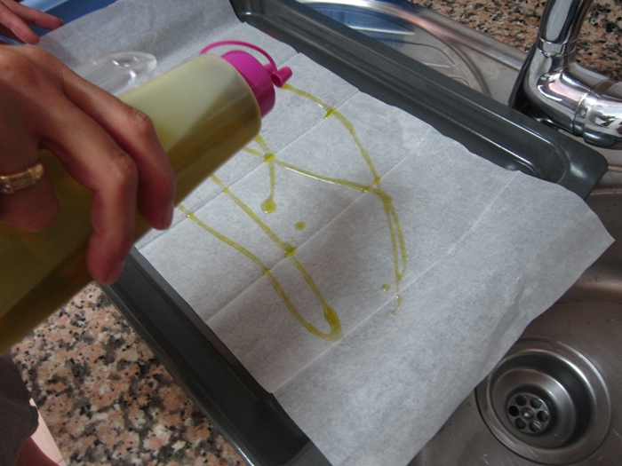 | Es posa oli al paper vegetal, que haurem dipositat en la safata del forn per a que no es pegue. |