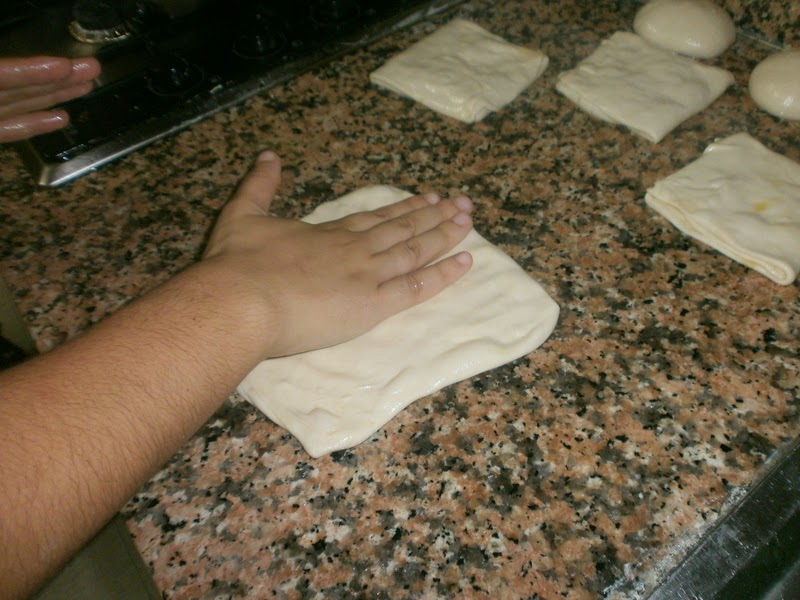 Dobleguem la massa en quatre parts, i li posem també una mica de samida i d’oli.