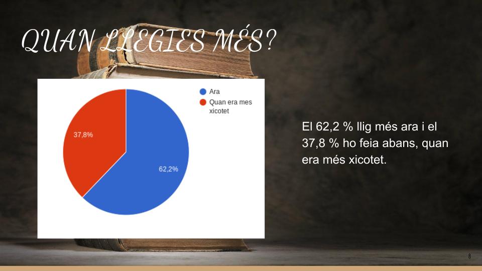 Per a començar vaig crear una enquesta a Internet i la vaig anar passant a tota la gent jove que conec. La majoria van ser de l’Institut, així que podem dir què és el que pensen els alumnes de la lectura.