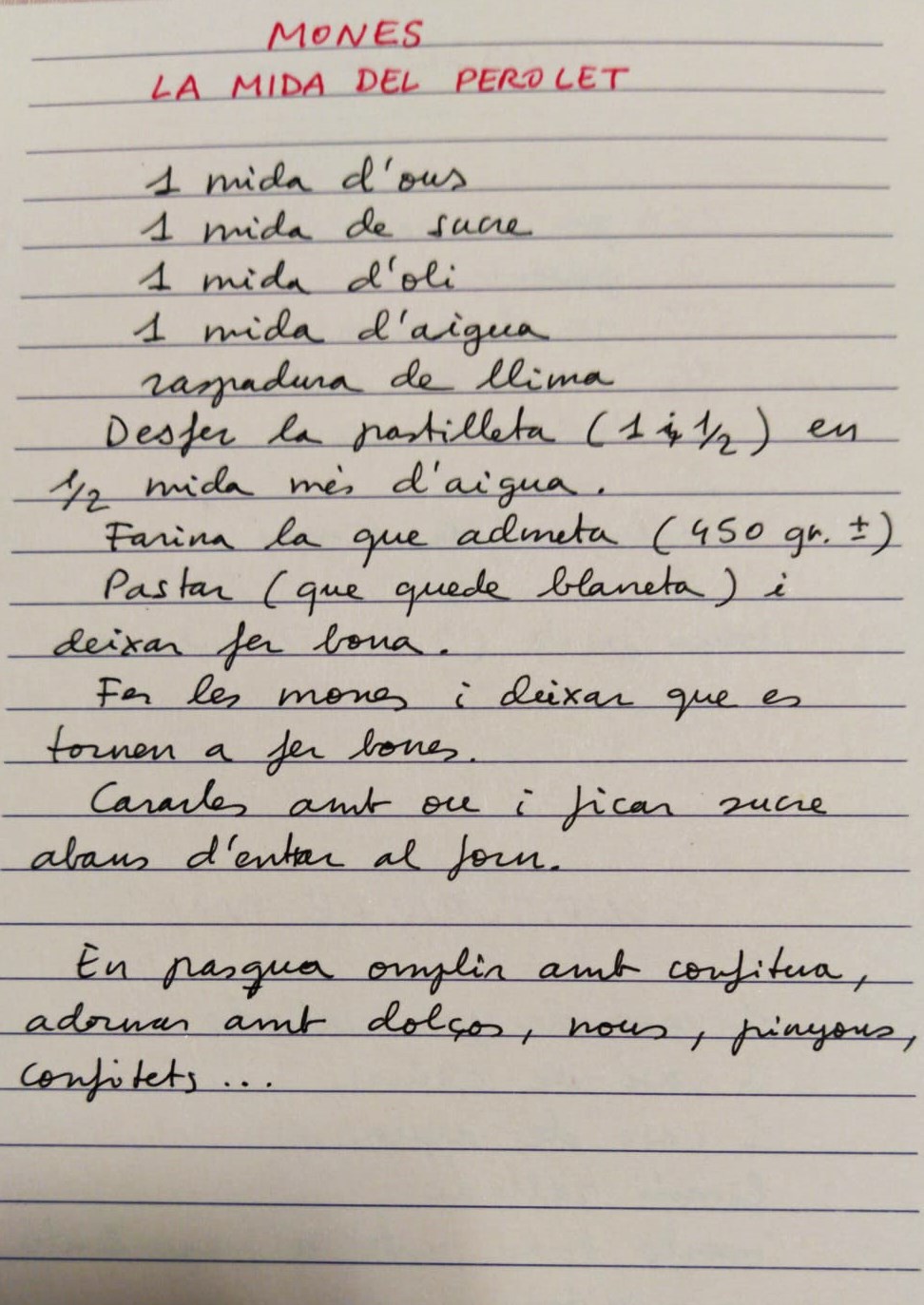 La pasta, per als llongos i les mones, és la mateixa. Mireu aquesta de la mida del perolet que ens explica tan bé la meua padrina, Rosita Guinot Bernat.