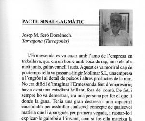 Fa cosa d’un mes que es va celebrar l’entrega del Premi Miquel Arimany de Narrativa 2020 a les Masies de Roda. Uns dies després arribava el recull de narracions amb el títol del conte guanyador: Pacte sinal·lagmàtic, de l’autor Josep M. Seró Doménech. El llibre inclou les quinze narracions finalistes, entre les quals hi ha Acompanya’m, de l’autor almassorí que fa aquestes ratlles. M’ha fet gràcia el fet que cada narració s’acompanya de la foto de l’autor i així, tot i que no vaig poder assistir a l’acte d’entrega del premi i diplomes, puc veure els rostres d’aquells escriptors i escriptores amb qui compartisc les pàgines del llibre.