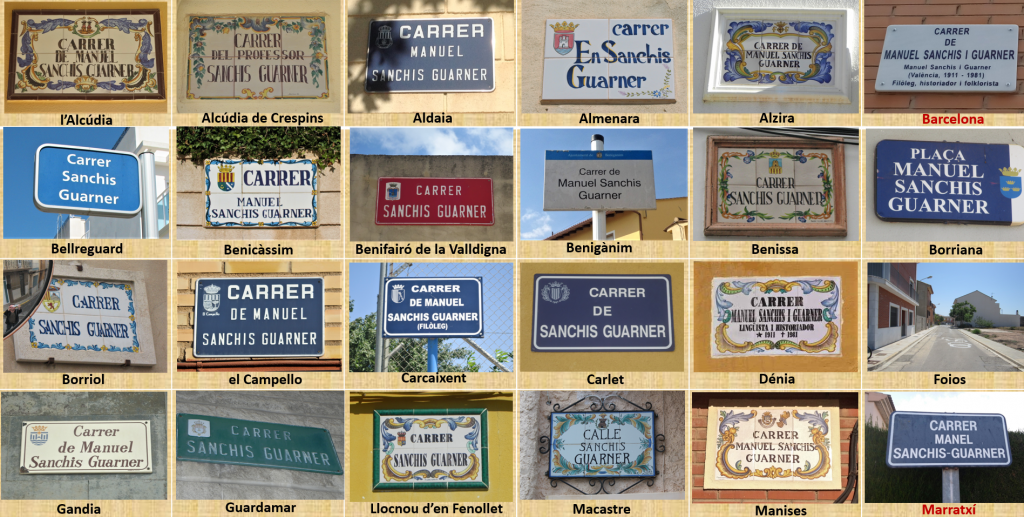 Us presentem un retaule amb la totalitat dels rètols (60) que cinquanta-set pobles valencians, un del Principat i dos de les Illes han dedicat al lingüista. Unes observacions sobre aquestes plaques i la seua ubicació, algunes curiositats i les pàgines del llibre Lingüistes pel carrer, estudi i proposta didàctica dedicades a l’autor, completen una aproximació a Manuel Sanchis Guarner des de la perspectiva del reconeixement a través de la retolació de les vies urbanes.