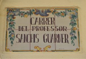 En els exemples següents veiem la placa de l’Alcúdia de Crespins amb l’ofici de professor; Barcelona afegeix al triple atribut de “filòleg, historiador i folklorista” la ciutat i les dates de naixement i mort; també Dénia duplica els oficis amb “lingüista i historiador” i, com Barcelona, proposa la ‘i’ que uneix els cognoms i les dates. Ben curiós resulta trobar a la placa de Massanassa el nom (Manuel), ben petit i adjuntat, com si perdonara l’oblit. Encara podeu cercar, al retaule de dalt, d’altres exemples ben curiosos, com el “Manel” de Marratxí i el guionet que aplega els dos cognoms; D. Manuel, a Massamagrell, o En Sanchis, a Almenara. No vam trobar cap indicació a Crevillent, i a la Pobla del Duc sembla que el nostre professor va ésser substituït per Romualdo Soler que n’havia estat el batlle. Cal destacar Macastre (la Foia de Bunyol) que, tot i ser castellanoparlant, dedica un carrer al també folklorista (recordem Els pobles valencians parlen els uns dels altres).