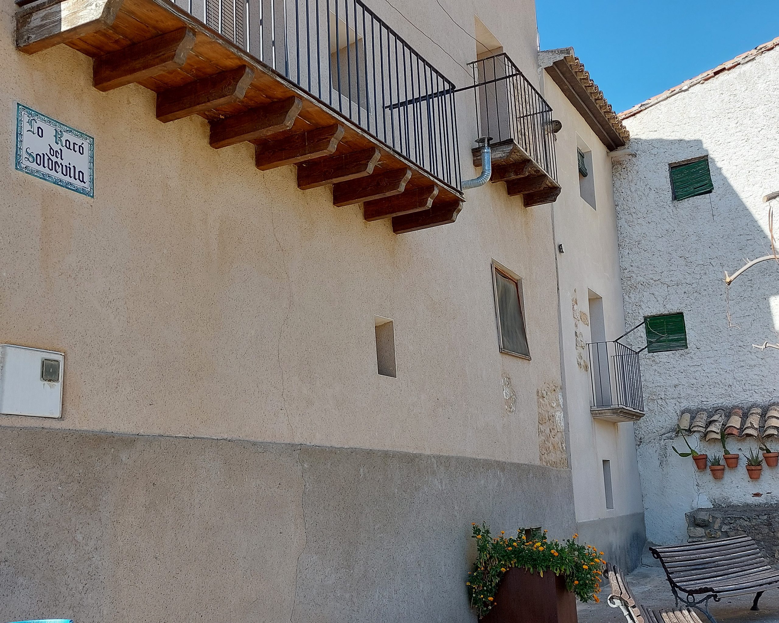 Travessem el portal del Soldevila (1746) i entrem pel carrer de la Font (calle la Fuente al rètol) entre grans cases amb belles portes i senyorials ràfels fins a la plaça Major. Abans, però, vora la carretera trobem aquest taulellet no oficial que, amb la llengua del país, bateja “Lo Racó del Soldevila“.