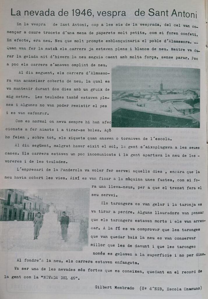 També va ser a La Vila-roja, dins del seu butlletí, on Gilbert Membrado, aleshores estudiant de 8é d’EGB, va publicar una redacció descriptiva d’aquella nevada que, després de les fotografies, us tornem a mostrar.