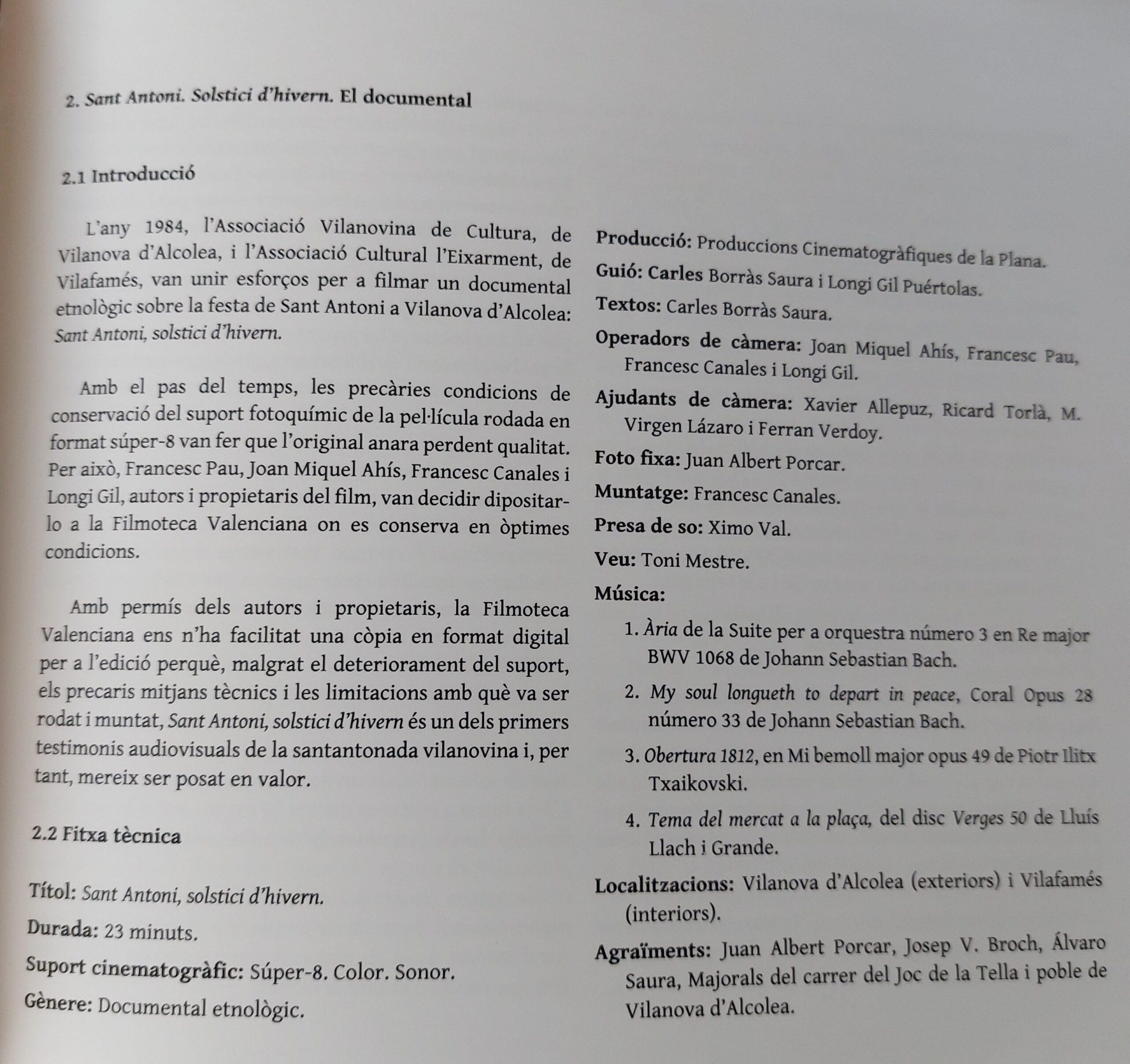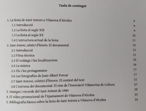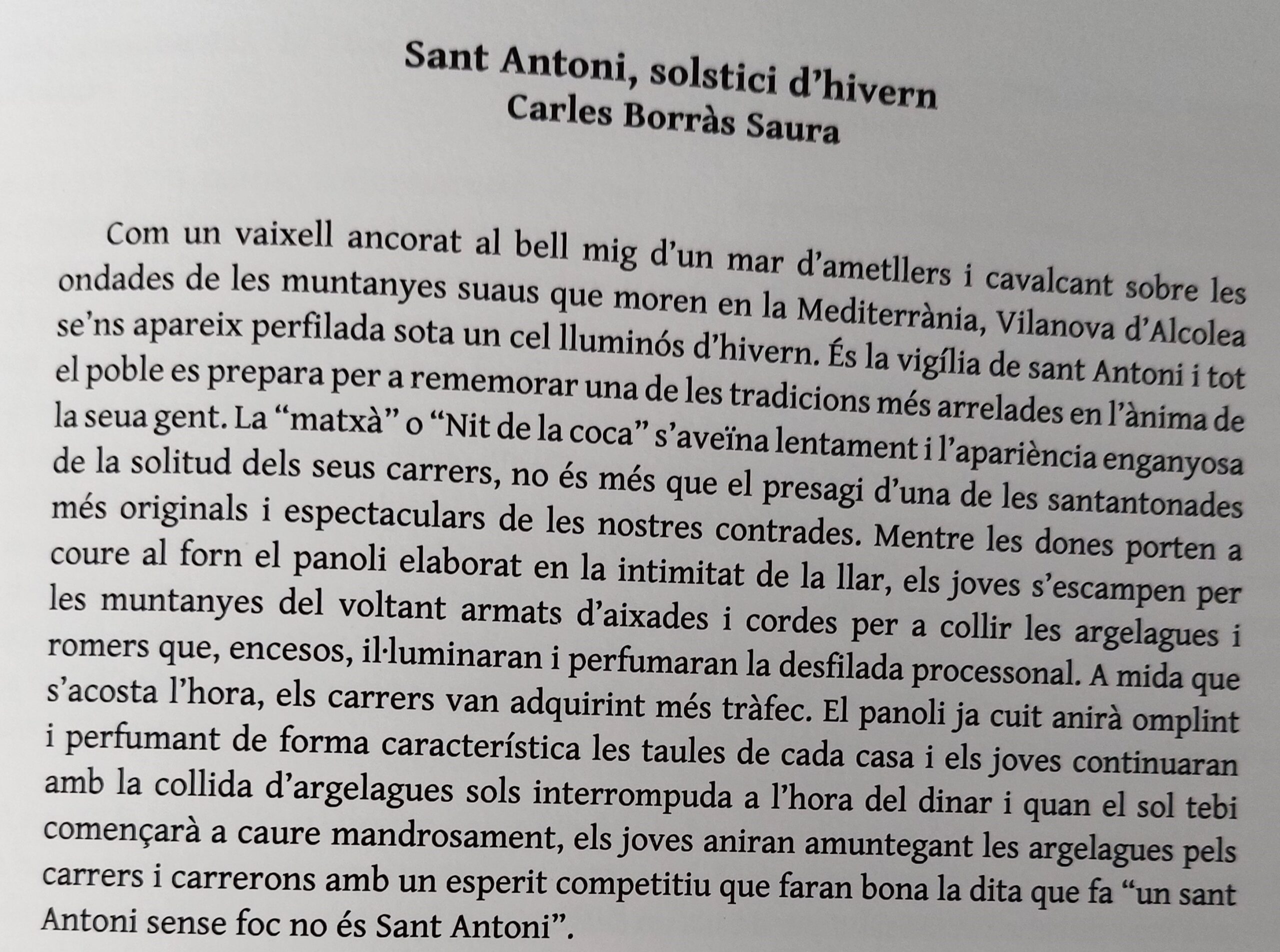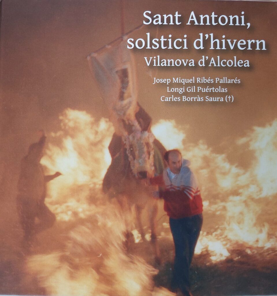 Abans de llegir el llibre, visualitze i escolte el documental Sant Antoni, solstici d’hivern. Una peça de Bach ben coneguda acompanya les primeres imatges. El clarinet té la mateixa textura de Sidney Bechet; l’he cercat sense èxit (desconec si hi ha cap interpretació d’aquell de Petit fleur de la Suite n.3). Després de Produccions Cinematogràfiques de la Plana, que sembla pintat amb ‘blanc d’Espanya’, sobre diverses fotografies de figures creuant el foc, apareixen els crèdits bàsics on, entre d’altres, descobrim l’amic Joan Miquel Ahís (càmera d’aquell Ulls clucs, que podeu visualitzar a la banda dreta d’aquest bloc). Toni Mestre posa veu al poètic text de Carles Borràs… “Com un vaixell ancorat al bell mig d’un mar d’ametllers i cavalcant sobre les onades de les muntanyes suaus que moren en la Mediterrània, Vilanova d’Alcolea se’ns apareix perfilada sota un cel lluminós d’hivern. És la vigília de Sant Antoni i tot el poble es prepara…”.