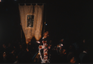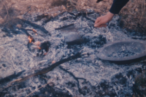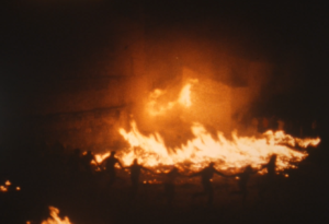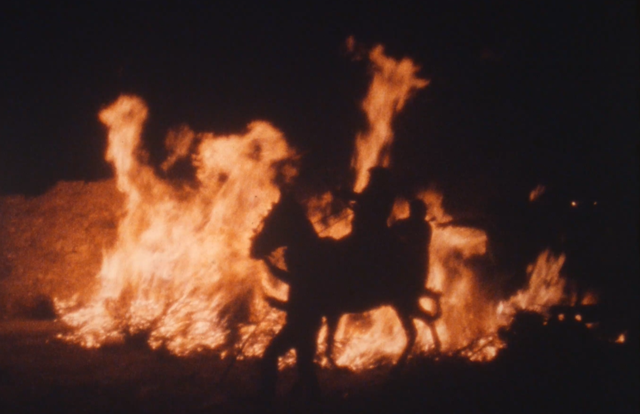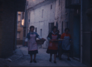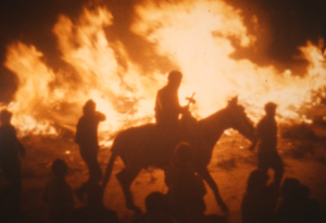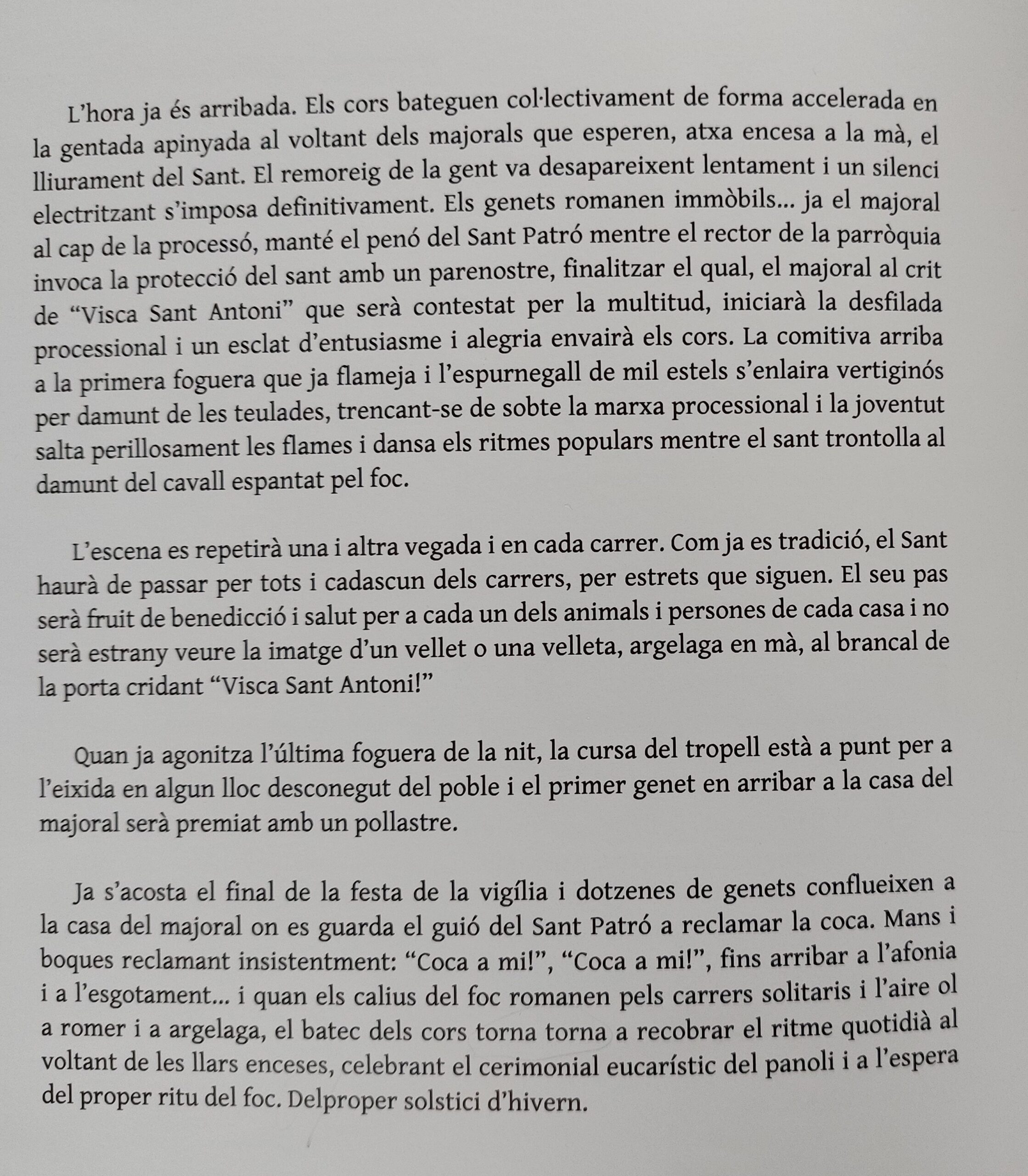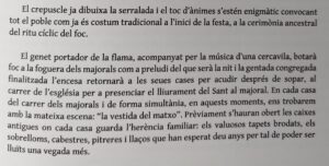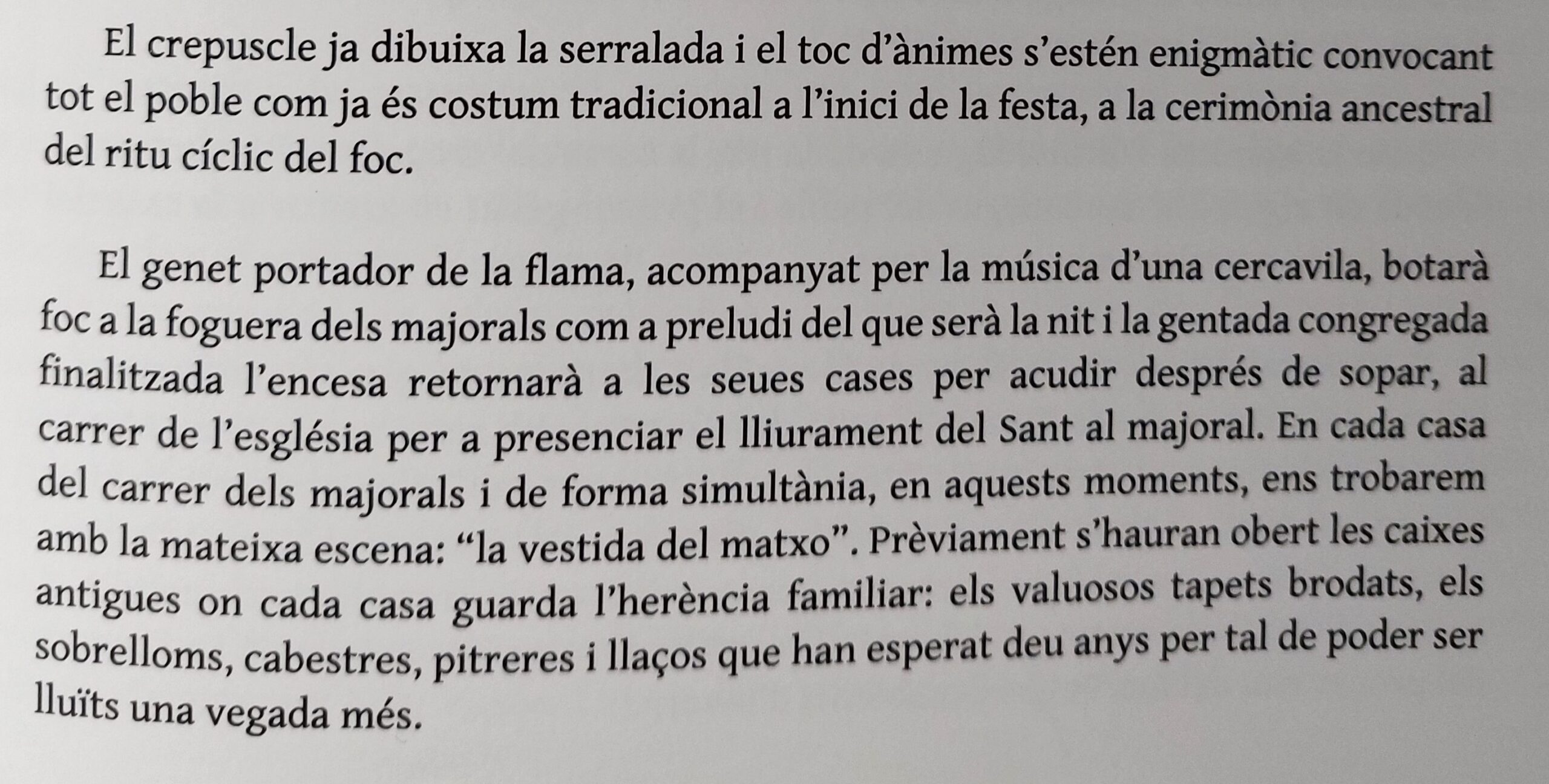 I veiem unes dones que ixen d’una casa amb un llibrell i entren a una cuina on emprenen l’elaboració del panoli. I mentrestant, al camp una colla de joves cullen argelagues i romers, matèria piròfita per a la nit. I la càmera entra a la cuina i ens mostra els detalls de les mans brillants d’oli i estima. Tornem al camp, on la joventut fa servir les primeres foguerades per torrar un grapat de peix, sembla xucla, i fer uns glopets de la bota de vi. Amb Penyagolosa a l’horitzó i música èpica, els joves omplen tractorades d’argelagues i romer… I el contrapicat li dona un to d’epopeia vilanovina, d’esforç abocat al foc que vindrà… Hi ha un incís d’unes imatges al crepuscle on un pastor acondueix la rabera cap al corral… el treball diari i la nit de festa! I després ve la banda que recorre els carrers i la vestida del matxo. Amb primers plans de valor etnogràfic amb els tapets brodats, sobrelloms i cabestres, pitreres i llaços… i una posada en escena gairebé nupcial (si l’Albert Serra ho hagués sabut haguera deixat el torero per poder filmar la vestida del matxo). I, en veure el llibre, me n’adone que no calia… que tot està contat, i millor contat! Reproduïm el poètic text de Carles Borràs, veu en off del documental.
